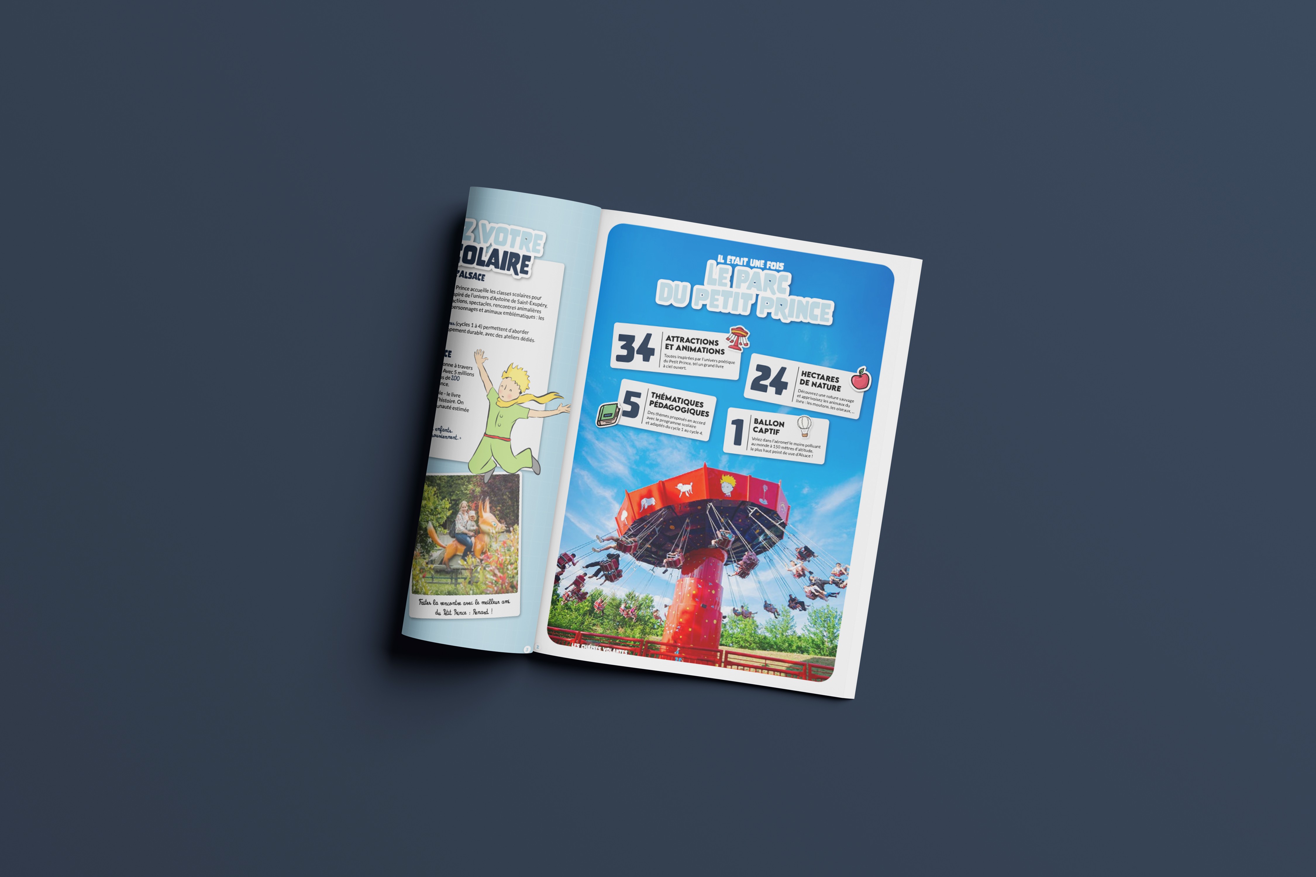 La brochure scolaire ne vend pas du rêve. Elle convainc un enseignant que derrière les manèges et les personnages, il y a une vraie démarche pédagogique : des ateliers, des apprentissages, une expérience qui prolonge ce qui se passe en classe. Le ton est rassurant, structuré, sérieux sans être austère. L'univers du Petit Prince y trouve une résonance naturelle avec ses valeurs d'éveil et de curiosité.
